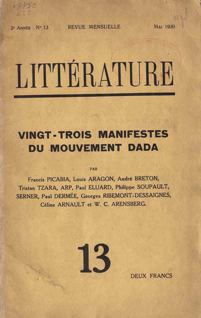 Y sí, en la bibliografía del libro que me había indicado aparecían, en la A de Louis Aragon, estaban recogidos por él en el número 13 de Littérature, correspondiente a Mayo de 1920. Indagué en la Biblioteca digital de la universidad de Iowa y allí estaba el ejemplar. Como es lógico un manifiesto es un texto escrito para ser leído, lanzado al público como arenga, por lo que la gran mayoría se perdieron, aunque sabido es que no hubo dadaísta que se preciase sin elaborar su manifiesto propio.