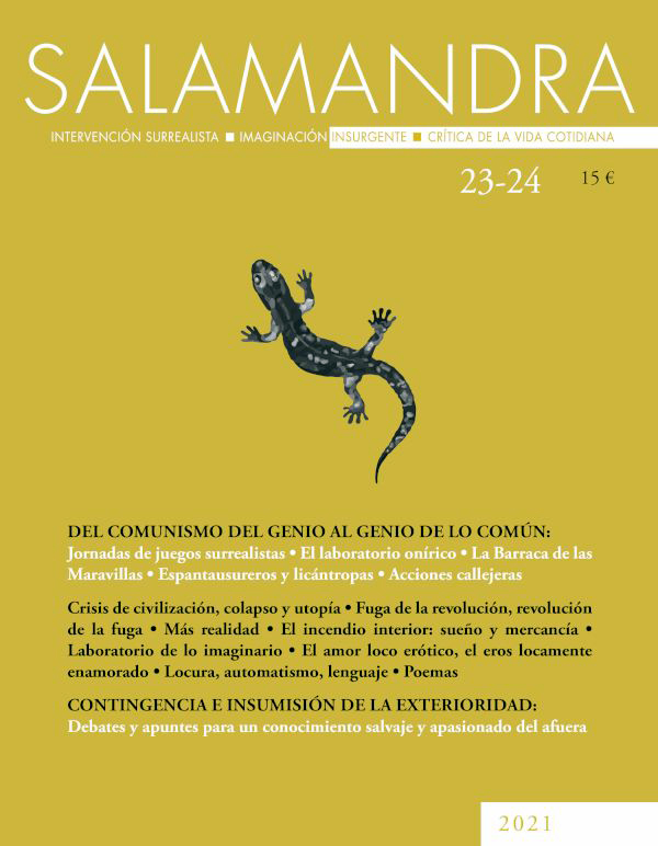Mirando estos días por internet y con la celebración del centenario del manifiesto surrealista en la cabeza, me he dado cuenta de que existe el grupo surrealista de Madrid. Hay más grupos surrealistas en diversas ciudades del mundo aunque, por lo que he visto, poco activos con la excepción del de Chicago. El grupo de Madrid (no he encontrado ningún otro grupo en la península) gestiona una editorial “La Torre magnética” donde publica textos de algunos de sus componentes y desde donde lanza una revista “Salamandra” que ya lleva publicados 24 números.