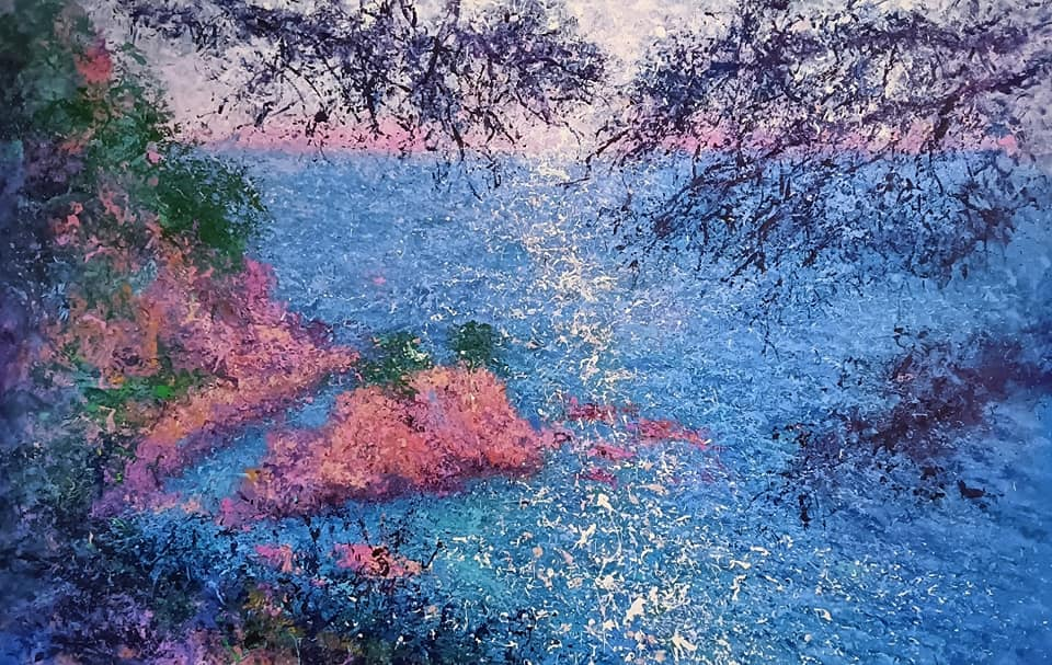 L’esplendor de la tardor reflectida al riu, quan les aigües passen en calma. Les diferents tonalitats del rosa a taronja, passant per violetes i blaus, creen una riquesa cromàtica espectacular alhora que harmònica. La tècnica impressionista és portada a l’expressionisme abstracte en veure’l de prop. Tècnica molt personal.